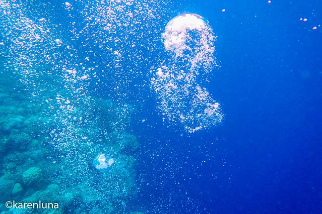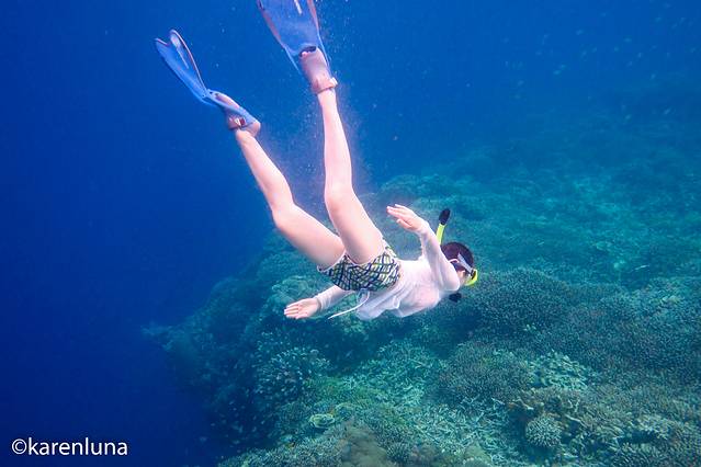 从悬崖上需要沿着陡峭的石阶才能下到水里,每个台阶真是又滑又抖,真怕一个不小心踩空掉下去。但当进入海中,立刻被眼前的景象所震惊,即使嘴里正叼着呼吸管,也抑制不住自己的喜悦,兴奋得叫着老公赶紧下水。