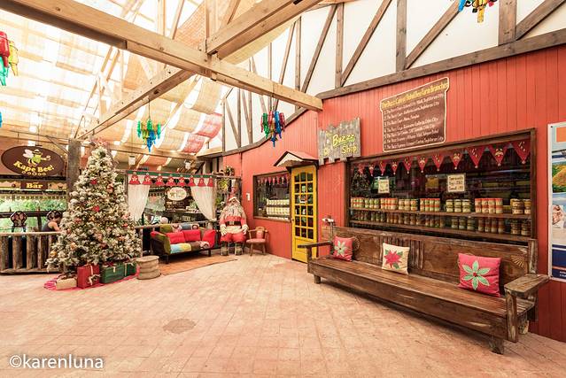 继续往里走来到农场,整个建筑几乎都是用木头搭建而成的,并且用椰子壳彻墙和铺路做一些点缀,也有很多场景是用蜜蜂做的装饰,很有特色也很自然。