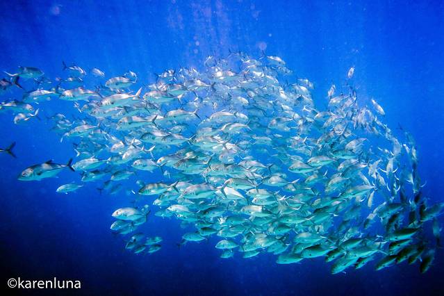 我一定是掉进了一个沙丁鱼罐头里,此刻目所能及的地方都有它们的身影。之前还觉得看到的杰克风暴已经是挺大一群里,现在这么一对比才发现,那只能算是“离家出走”的零星几只,简直太少啦。越是朝着鱼群游,越发现鱼群移动的速度超级快,没追一会儿,居然有种晕晕的感觉。密集恐惧症患者还是妥妥的不要下来了,看到这么多密密麻麻的沙丁鱼可能会疯吧~