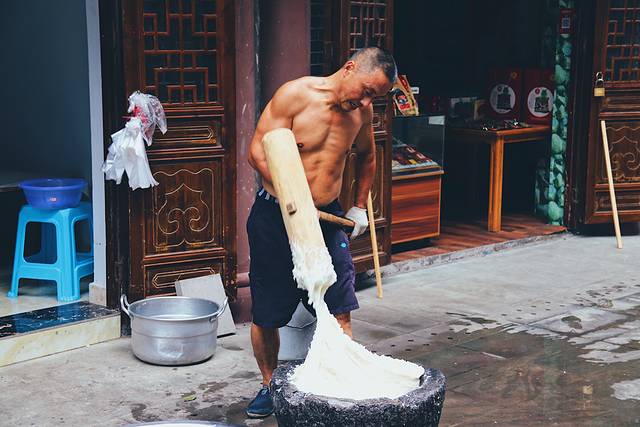镇上的店铺主要是售卖武隆的酸辣粉、羊角豆干、高山茶等土特产,有很多是现场加工制作,边逛边吃也蛮不错。