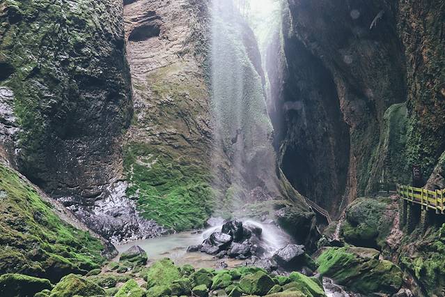 峡谷两边都是悬崖岩壁,植被茂密,沿着在峭壁上开凿的路徒步到谷底,仿佛来到了另一个世界。地缝极其狭窄,也真是一个绝妙的藏身之处。