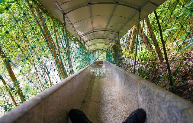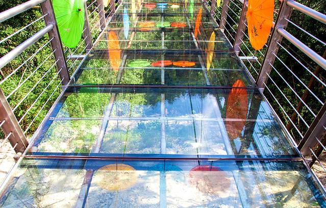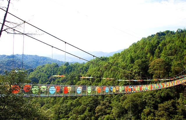 九龙江玻璃桥悬于120米高空之上,桥身全透明设计,森林美景尽收眼底,漫步其中,犹如闲庭散步;桥上布置着五颜六色的油纸伞,仿佛置身于童话世界,穿越到另一个浪漫时空,俯视下方,却又步步惊心!