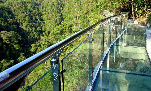 九龙江水幕玻璃栈道,全长488米,栈道贯穿飞龙瀑布,气势磅礴,蔚为壮观。栈道周边林荫密布,站在栈道上,感受飞流的瀑布,心旷神怡,沁人心脾,素有“挂在瀑布上的玻璃栈道”之称。