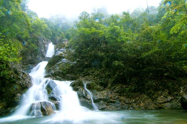 啸龙瀑布气势雄伟,落差高达80米,流经石壁,经过三次转折、四次跌落,最后才窜进溪中的水潭,发出阵阵轰鸣,溅起漫天水花,非常清凉。