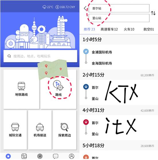 如果时间不紧张,有家人朋友一起,坐火车也是一种悠闲的旅途~那我建议可以在首尔乘坐itx,大概话4个半小时能到釜山站(42600韩币,这个人民币260左右)。当然还有很多其他的到达方式,我附在下图了,大家自行参考(App:韩国地铁,这次旅行一直只用这个了)。