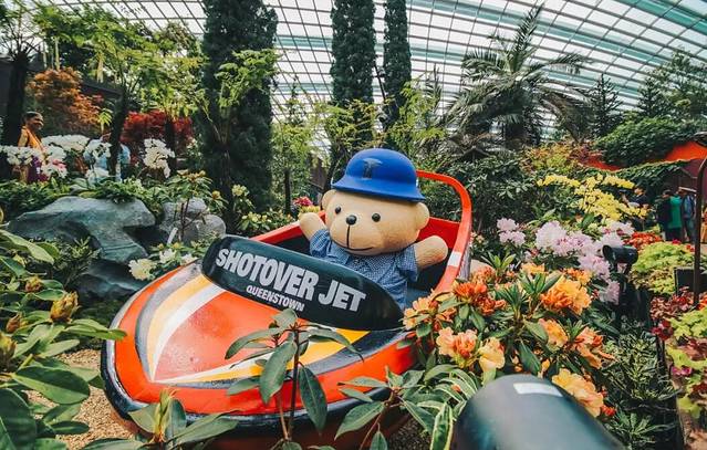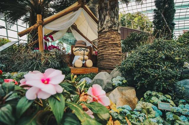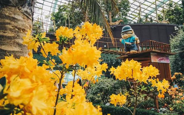 这片精心设计的“公园绿地”,还非常适合来一场轻“徒步”。花丛间搭起了木栈道和索桥,让你可以更近距离的观赏不同种类的杜鹃花。你看,还有淘气的小熊爬上了一旁木制的瞭望塔,登高望远,饱览花穹中的盛景呢~