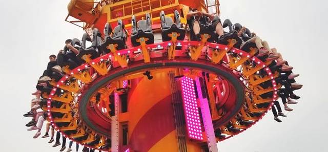 跳楼机:我第一次玩,所以我不是很清楚65米的跳楼机是否算高,反正在下面看别人玩的时候,额,就听见了尖叫连连,下来的有些女生落地的神情各异,但都是一副丢了魂的神态,听听下面解说员的解说词:上去要两分钟,下来只需两秒钟。听完,腿软者有之,语慌者有之,惊惧者有之,反正神态各异,都是惊慌失措的样子。