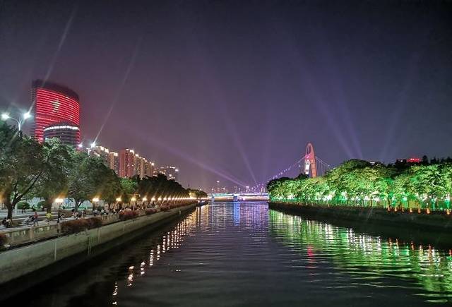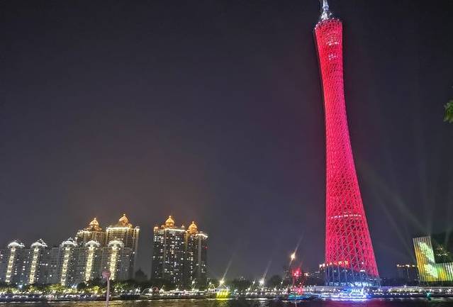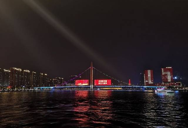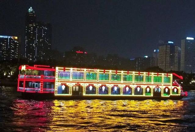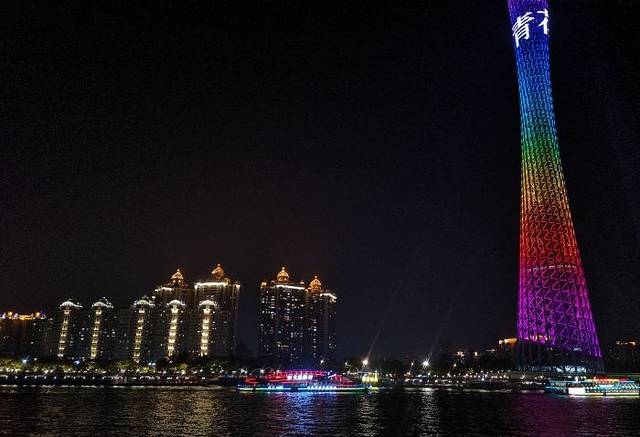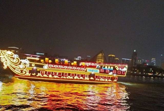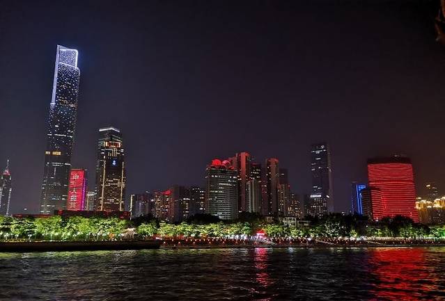 饭后,广州塔下珠江岸边,码头上停着我们今晚乘坐的邮轮,金碧辉煌,满船的灯光下,映照着珠江显得格外的光彩照人,上船,游荡在珠江之上,夜晚的珠江在广州塔下像是个翩翩少女,摇曳着动人的舞姿吸引着世人,珠江沿岸的建筑全都灯光闪亮,拍照、兴奋、思绪万千,夜晚的黑幕下,五彩的广州塔像一杆笔直的枪直冲云霄,而塔下的珠江便是广州的生命之源,泛舟游于珠江之上,不免显得格外逍遥自在。船停人散,回家。