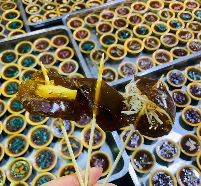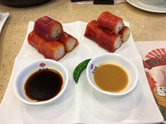 外皮油润,由红米磨成浆,用广式传统布拉肠做法做成肠粉,再裹上脆口网皮和新鲜虾仁,口感非常丰富,再蘸少许酱油或是花生酱,堪称一绝,强推!