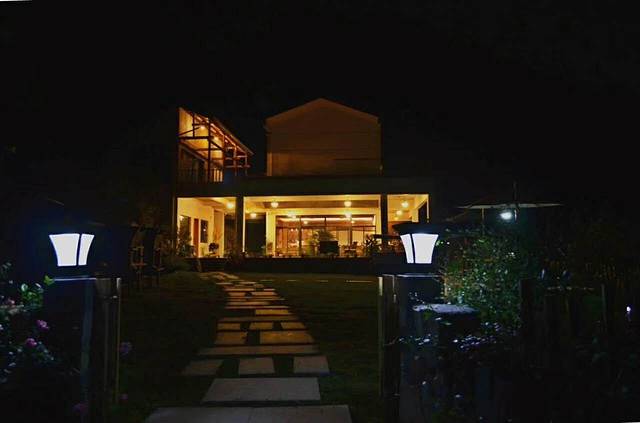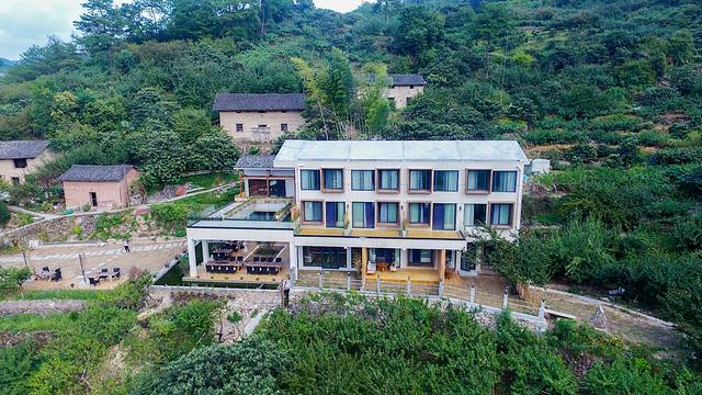 行不多时,来在石阶尽头,位于半山腰的民宿主体映入眼帘。和预想的并不一样,既非篱笆小院儿,也非青砖瓦房,一座集淳朴外观和实用功能于一体的建筑,巧妙地结合了传统和现代两种概念,就像是一位姑娘,青春靓丽却又不失落落大方。