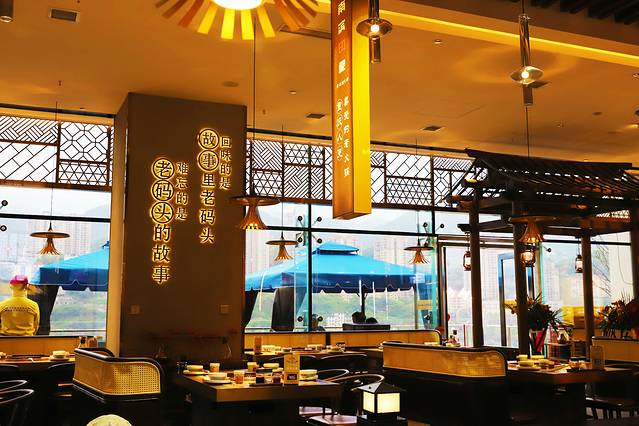 火锅店的位置不错,一边挨着江边,有一个打卡点,设有四桌观江位,需要提前预约,想边吃火锅边赏江景的可以选这里的位置,但是建议晚上选江边位,这样才能观赏到最美的山城江景夜色。室内还有两只可以吃火锅的船,设有包间,也都是需要预约的。