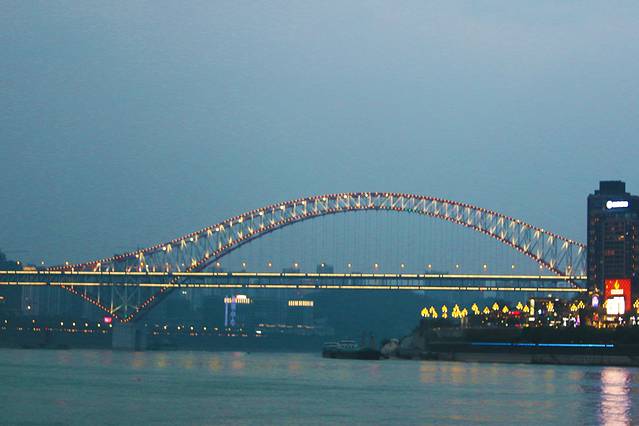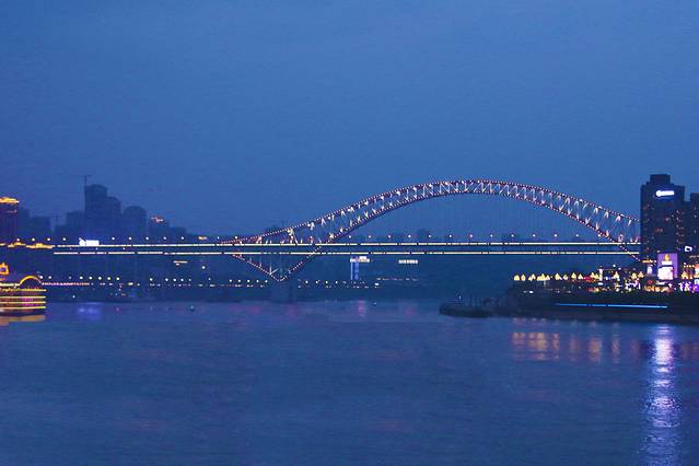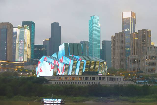 站在朝天门广场,俯瞰长江和嘉陵江,两江汇流之处,纵览沿江风光,天亮着的时候看到的江景很一般,等到天黑的时候再看,就是另一种灯火辉煌的美感。