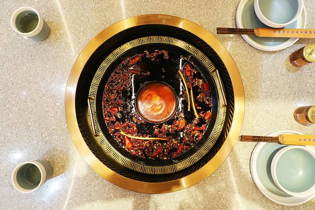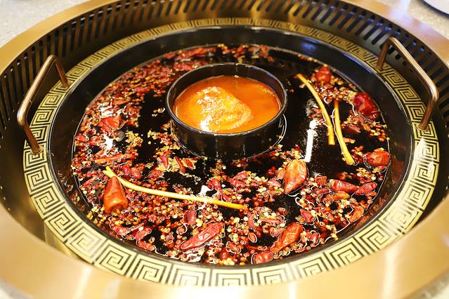 我们两个人要了一个鸳鸯锅,选了传统的牛油老火锅中辣和番茄,中辣其实已经很辣了,像我这种外地过去能吃辣的都觉得辣,越煮越辣,也越香。