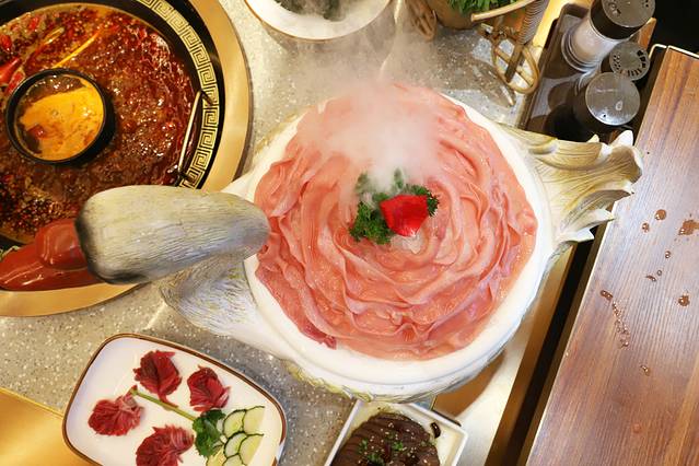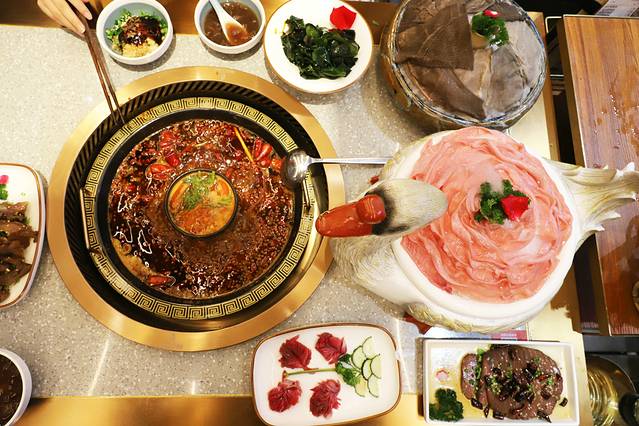 九尺记忆鹅肠,用巨大的鹅形盘子装着,满满的盘了一整盘,量很足,因为是一整个肠,下锅前服务员会主动帮忙用剪刀剪成合适的小段在下锅,在锅里七上八下就可以吃,口感又脆又滑,嚼劲十足。瞅了有人的座位,基本上每桌都点了。