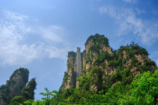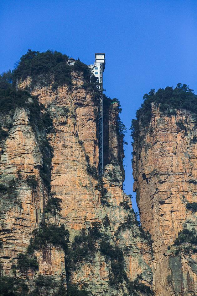 张家界鬼斧神工,可百龙天梯却是人类文明,这种反差制造出来的意外和谐美令人印象深刻。百龙天梯外边看起来很壮观,从远处看更是像一条瀑布,和周围的景色完美的融合在了一起。