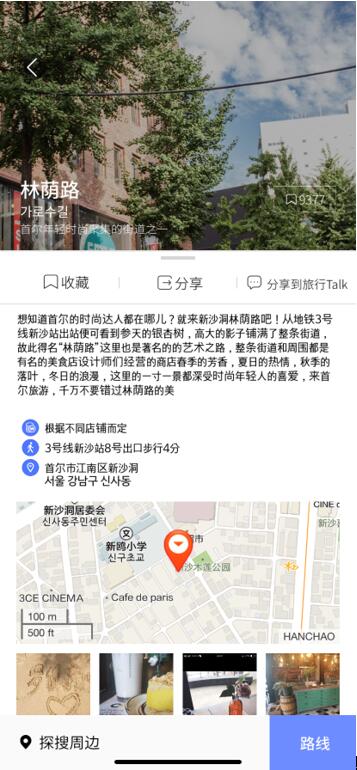 林荫路除了逛街以外,还有记得美食打卡。大家可以在小红书上种草非常想去的店,记住地址,按照地图导航过去,也可以在一个叫做“韩国地铁”的手机应用上,使用“探索周边”的功能,直接定位自己目前的位置,看到生活在自己周边所有的美食店信息。(每个店铺里面的主打菜单,和价格都有在这里标注出来,甚至是逛街逛到很晚,也可以看看周围有哪些店面还在运营,因为这个信息栏里面有每个店家的工作运营时间。)