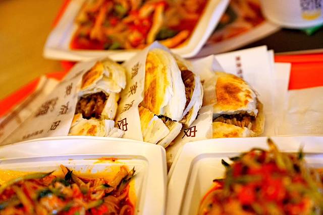 肉夹馍是凉皮好搭档,后来一路所见的 潼关 肉夹馍也很多,焦脆的口感,涵弟爸爸说那些都是改良过的肉夹馍,并不是传统意义上的 西北 肉夹馍了。但是我觉得也蛮好吃的,像焦脆酥皮的千层饼夹肉。