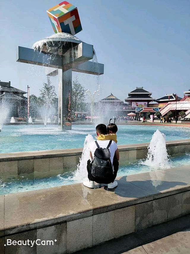 到达方特时间还没到9点,还不能进园。爸爸们带着孩子在园外看喷泉。我去探了探路。