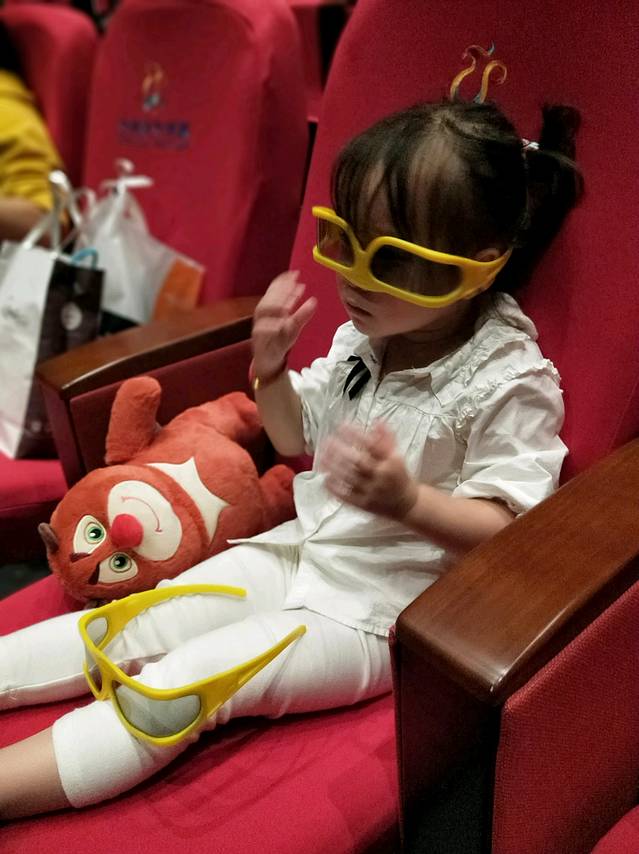 小屁孩生平第一次看5D 电影,没坐过旋转座椅,兴奋得不得了。屏幕很大。画面有水果,小鸟出现的时候小屁孩都会情不自禁的伸手去抓。