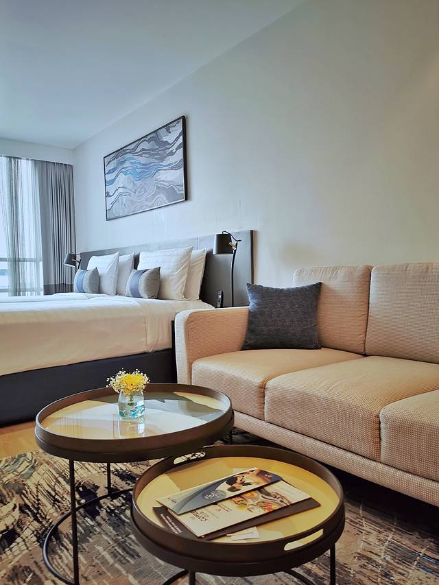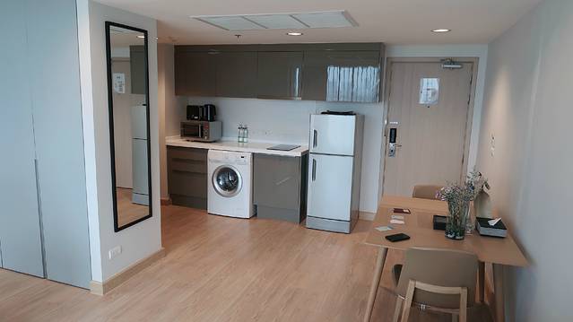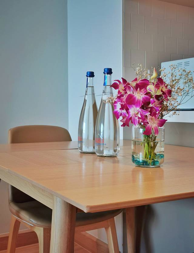 宽阔的房间干净整洁,自带厨房还配上舒适的沙发座椅和质量好的木桌、小茶桌,桌上摆放着鲜花,格外舒适。房间阳光充足,拉开窗帘既能看到曼谷繁荣的城市样貌。