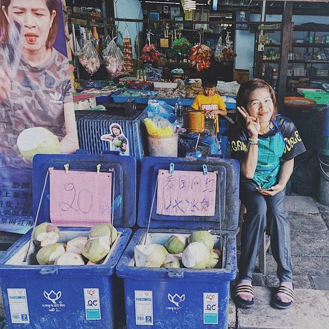 “甜甜甜、冰冰冰、好喝好喝……”是专属冰冰姐本人的口头招牌,每次吆喝都特别卖力,每卖一只椰子都会跟顾客互动,十分好玩。做生意很拼也有原则,20泰铢一只,每开一个椰子都会确认是否甜,不甜直接扔了,在这里边喝冰冰姐的甜椰子边走在铁轨上也是惬意十足。