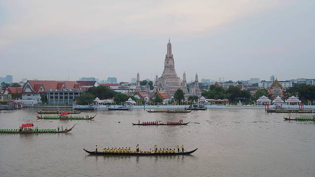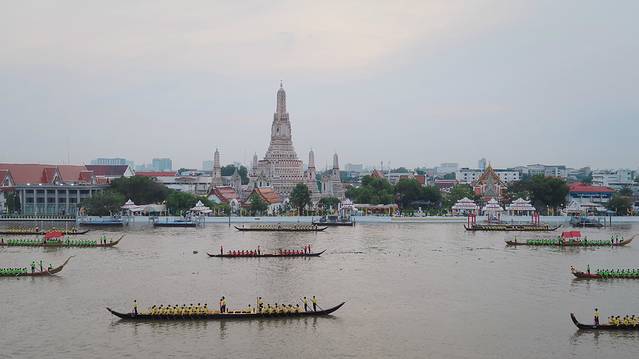 刚好偶遇泰国十世王加冕水上大巡游船队第5次演练,这是泰国陛下加冕的一种传统习俗,会在湄南河举行加冕仪式,即船队水上巡游,当时参与人员2200人,52艘船在湄南河一路高歌前进,画面十分壮观。