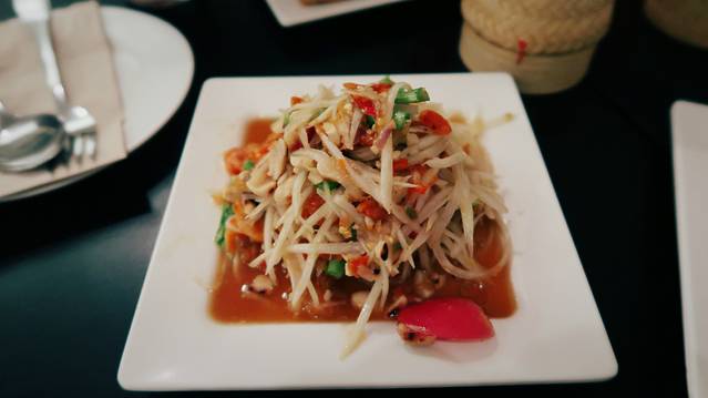 这道菜深受老百姓的喜欢,所用到料理最能代表泰国菜的酸甜辣口味,食材有青木瓜、小番茄、生豇豆、花生米,再加上鱼露、椰糖、青柠檬配料就做成了一道酸酸甜甜的菜,适合减脂的人吃。对比上一家的青木瓜沙拉,这家的味道更可口。
