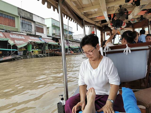 比较接地气的按摩被称为“马杀鸡”,属于传统的原始按摩,注重大力道的身体推拿,起到舒筋活血的作用,游船上的按摩师力道适中,用泰式古老的按摩手法从脚指头开始作业,按、捏、挂给脚活络筋骨。