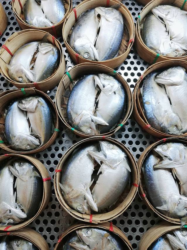 鲭鱼,在夜功府你会经常看见这种鱼被装进竹蒸笼里,可爱的鱼头弯侧一边,这是当地人对鲭鱼的一种偏爱,可以做成一道传统的家常菜。
