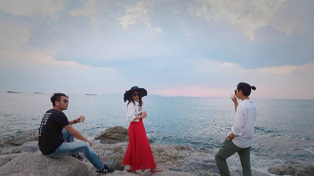 6-10月是泰国雨季,那天傍晚芭提雅应季下了一场大雨,原本以为看不到落日,然而大雨刷刷下了二十分钟就停了,雨后天晴,海的气息变得清新,傍晚海滩的气温更加凉爽。二话不说的我们一早把准备好的便携式咖啡和保温杯带到海滩旁,几个人走走拍拍,非常享受芭提雅海滩的黄昏时刻。当然了,我们最想做的是寻找一块好看的礁石,在礁石上泡咖啡!等落日!在芭提雅海滩上这样做会很不一样吧?