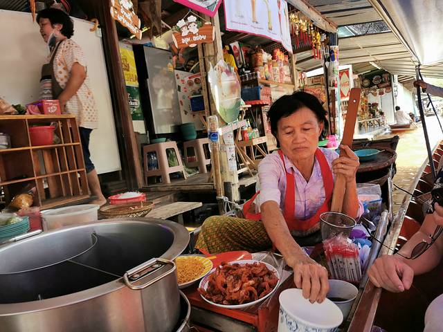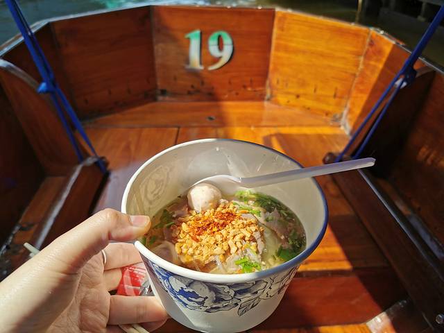船开到集市中心才是最热闹的,一艘艘手摇小船穿梭于河流间,吆喝卖着各类小吃好不热闹。船是她们出行的工具,也是她们的摊位,每家一两条小船出门买卖,船上装满了各类水果,也有直接在船上开灶,现做现卖,推荐这里的米粉汤,很好吃,加点泰国辣椒更有风味。