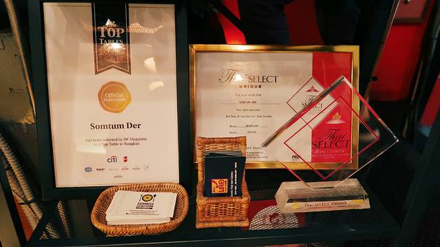 Somtum Der餐厅因为出色的菜品获得不少荣誉,入选曼谷最受欢迎的BK杂志,获得泰国菜的认可印章,同时为米其林星级餐厅,背书就不多说,一起来见证什么是泰国的东北菜吧。