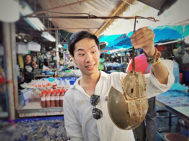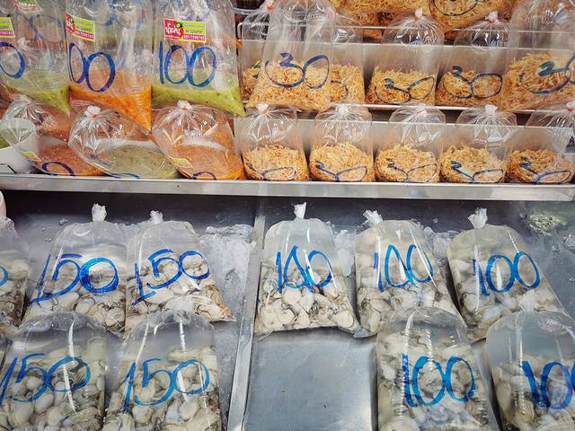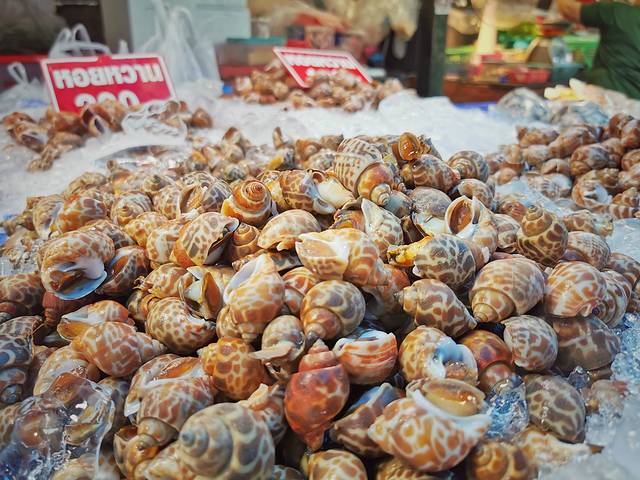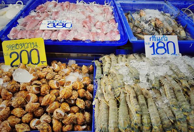 海鲜市场旁边有一个很大的免费停车场,下车后会闻到一股海腥味道,这里人流量很多,走进菜市场大开眼界,肥美的虾、蟹、贝类、鱼类、螺类应有尽有,东西都是明码标价。大多海鲜的价格都在140-280泰铢一公斤,大青龙一个需要1200泰铢,虾和蟹200-300泰铢一公斤。
