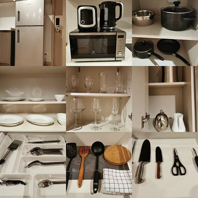 这家的酒店性价比非常高,公寓式结构适合一家大小或与朋友居住,因为房间自带了家居式的厨房,打开厨具会看到很多精致的厨房用具,还有冰箱、烤箱、刀叉和酒杯等等,干净整齐地摆放。