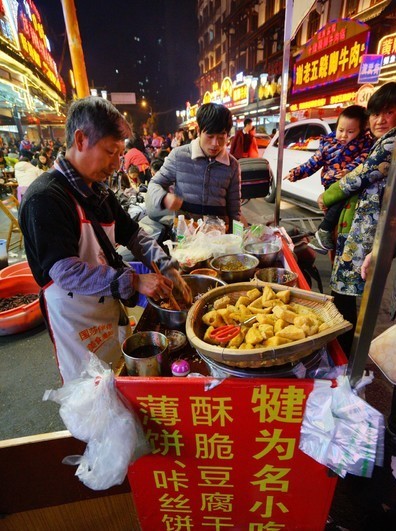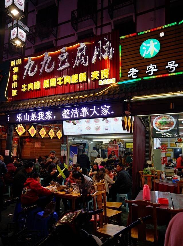 “乐山的大街小巷都有好多小吃,烧烤钵钵鸡豆腐脑还有甜皮鸭”