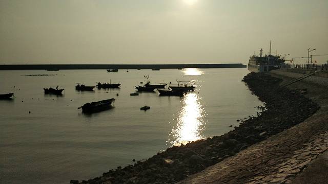 港口金光闪闪的落日~稀稀拉拉的小船······一切都是那么和谐