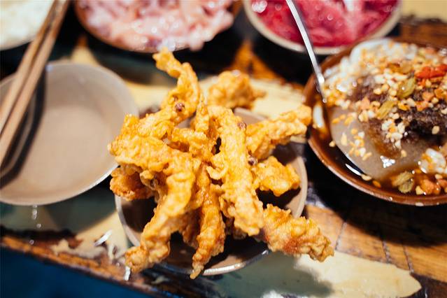 吃火锅前等菜的时候就可以先点一份现炸酥肉尝尝鲜,刚炸出来的酥肉皮泛着油光,外皮嘎嘣脆而里面的肉又不腻,美味的酥肉暂时让你忘却等待的饥饿。