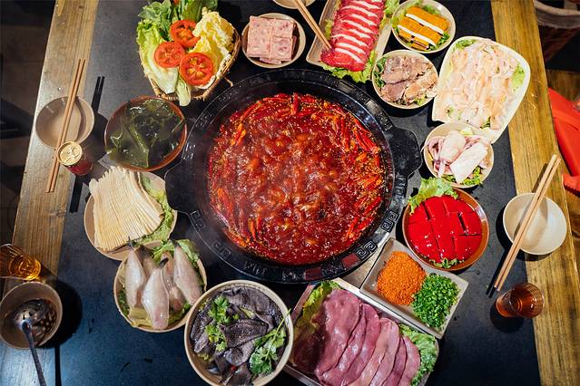朋友们,选红汤锅底一定要加上鲜鸭血,在锅底煮过后粉嫩软绵,再浸入红油汤汁,口感贼好。这边的红汤锅底稍微偏辣,不太能吃辣的朋友记得说要微微辣或是直接点鸳鸯锅底,此时此刻觉得能吃辣实在是一件美好的事情,无辣不欢。
