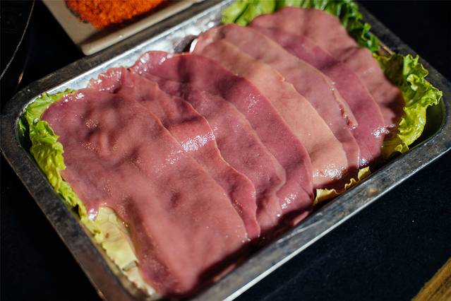 猪肝是这个店里的王牌菜品,优秀的牛油锅底能把猪肝的腥味一扫而光,只留下鲜与嫩,口感一级棒。毛肚也是大片的,一片刚好塞满一口,经过“七上八下”的煮炼,刚好的成熟度裹上特调的蘸料,香脆麻辣的口感无与伦比,现在回想起来都口水直流。