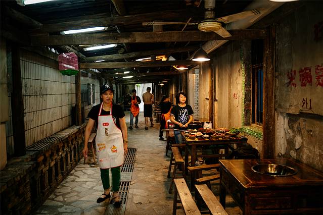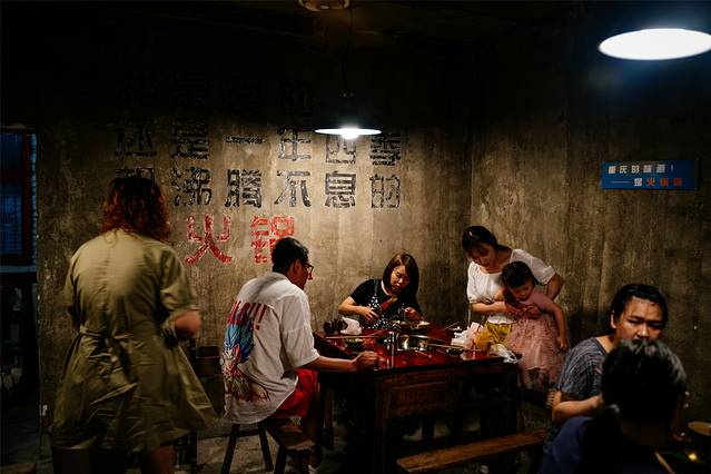 墙面可能是因为老旧的原因变得格外的有风味,还能看见张贴的老重庆照片和一些重庆谚语,在这吃火锅,仿佛自己也是个重庆人。大家也不在乎空间是否宽敞,都甘心坐在巷子里只为这美食。