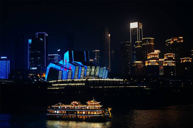在桥上能看见造型各异的游船在江面缓慢行进,在漆黑的江面上霓虹彩灯显得格外耀眼,游船上所看见的重庆夜景一定也是另一番风味。