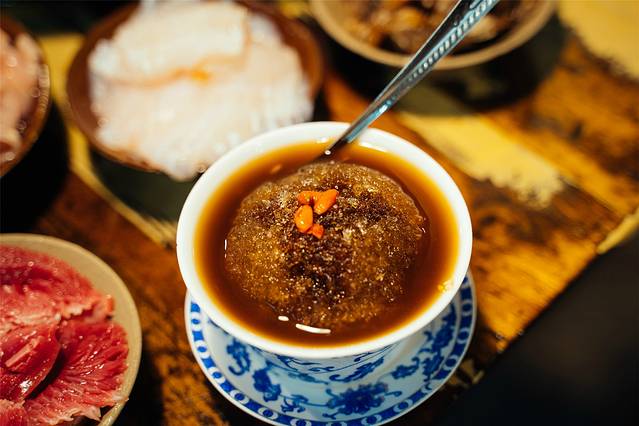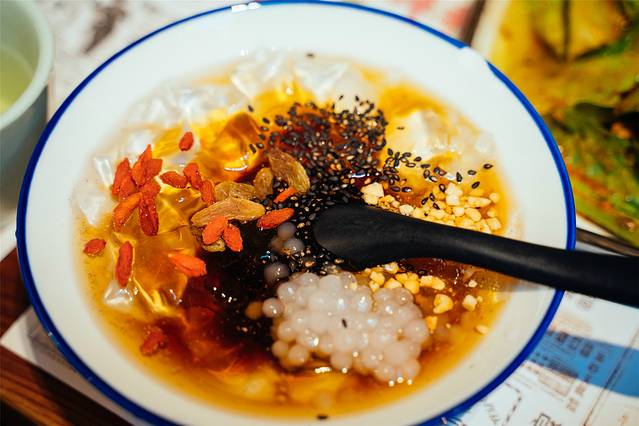 一顿完整的火锅一定少不了甜品的辅助,体验冰火两重天的感觉就在此刻。一份冰粉加上特色冰汤圆,汤圆装在茶碗里很特别,他家的手工冰粉也很nice,配料的玫瑰、花生碎、葡萄干、山楂都很香一点没有放久的干瘪感,冰甜冰甜的感觉十分爽口解辣。