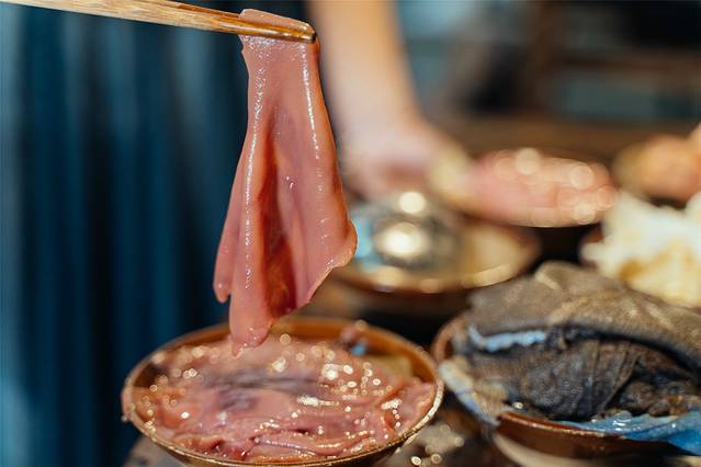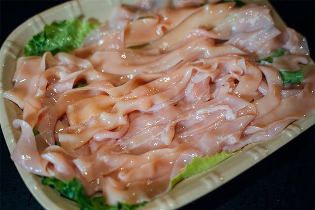 平常吃烧烤就喜欢吃鸭肠,所以涮鸭肠也是我的心头爱,阿罗说涮鸭肠也有手法——“提3下,摆3下”,差不多10秒左右。我试了一下口感十分爽脆,非常入味,很有嚼劲,以前都是在锅里放太久有点老。