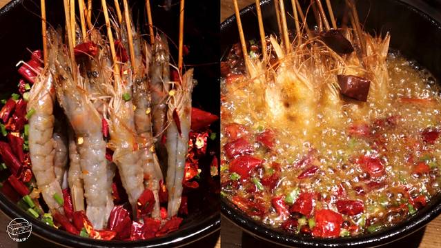 裸奔坨坨虾,是已经去了壳的虾串上了签签,用热油淋熟的,吃起来很方便。