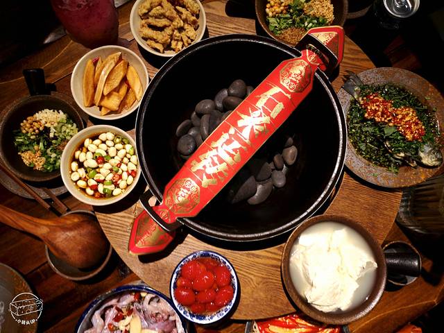 在滚烫的鹅卵石锅上,淋上红油汤汁,在焖煮6分钟就可以吃了。