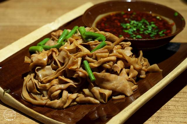 韭菜蘸水鸭肠,鸭肠吃起来很嫩,垫底的豆芽菜,非常清爽且干净。蘸水是酸辣口味的,搭配鸭肠也是绝佳。