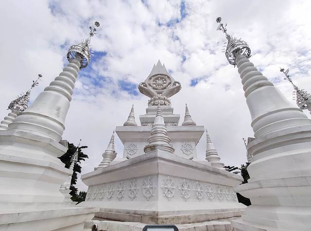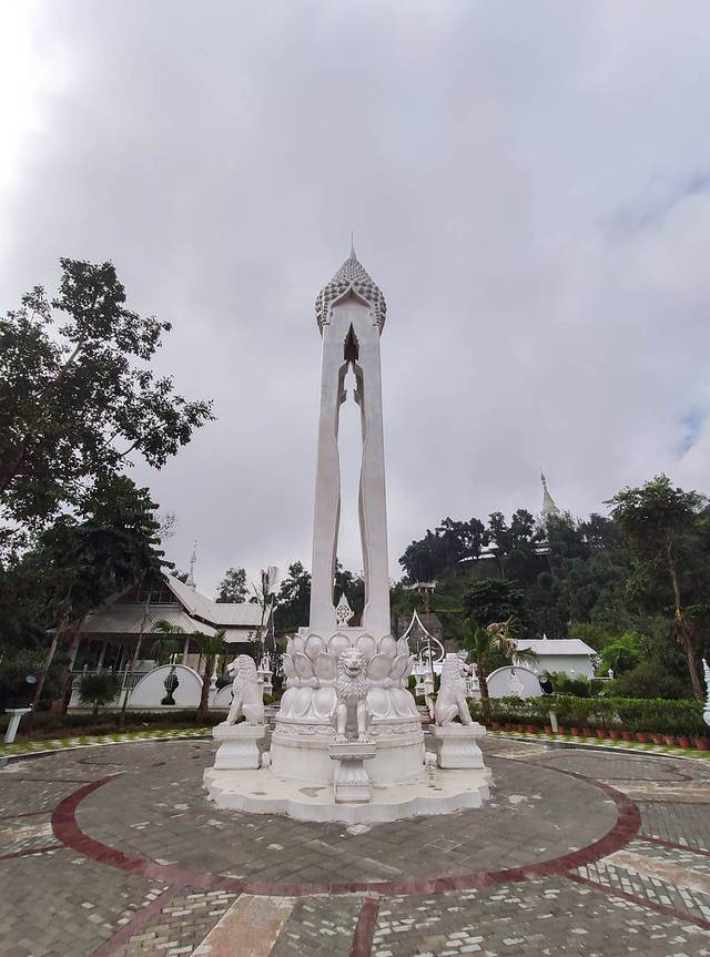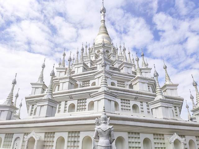 勐焕银塔也是 芒市 大银塔,紧邻着勐焕大 金塔 ,是近几年才修建起来的一个建筑 ,塔内目前不对外开放,但面积要比 金塔 的大,可游玩性比 金塔 的高,总体来说性价比也是较高一些的,从历史意义上来说, 金塔 绝对是比银塔的要好。两座塔只有一条小步行街的距离,两旁商铺售卖着各种水果汁和工艺品,该景区的位置在机场禁飞区的边缘上,所以一般不能放飞航拍。