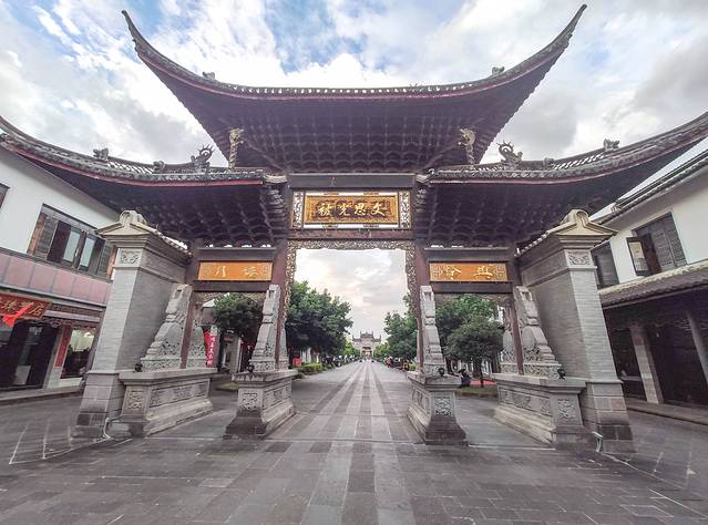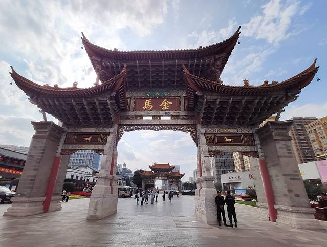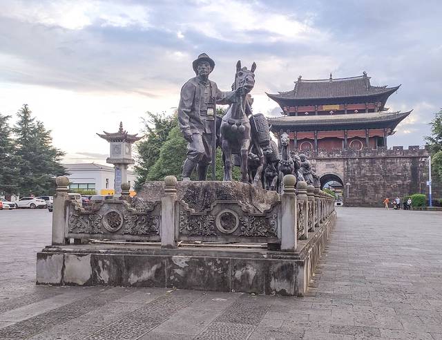 里面有几处牌坊和城楼,像是记录着古时这里的丰功伟绩,在另外的一个楼门看到,一处雕像,歌颂着马帮的人经商的故事,经过事后的翻查,这里的珠宝业也是很兴旺,当时靠马帮的保镖等人运送到往返 缅甸 等地