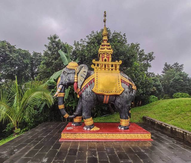 勐焕大 金塔 面积不大,围绕大 金塔 一圈只需要两分钟,可以入塔内参观,内部展出多件古时地位高尚僧人所用过的物件,也像是一个小类的博物馆,能从展示的场地当中感受到以前的风土人情,人们都习惯在 金塔 边上转三圈,以求功得圆满。细心的可以发现,建筑物上都有孔雀的形态修饰物,同时也有孔雀的石像,可见孔雀在这里是被当作神兽一样尊敬