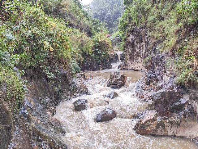 一直往上,没过多久就到最大的热祸,热气与湿气同时相遇,烟雾云绕。看到有工作人员从池子打捞过来的沸水,直接倒入小桶内,旁边 也有一处免费代客煮蛋的服务告示,温泉是这里的特色,但99度的水不能直接泡,于是景区想出一个办法 ,在旁边的空地上建起了一处泡脚的地儿,找来技师和药包等,形成了一个天然的按摩泡脚场,普通泡一次要四十元,加入药包五十八,还有按摩等,都是明码标价,自愿消费。